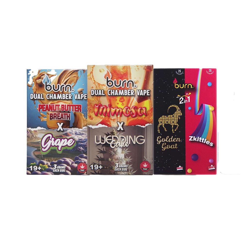 You’re not seeing double, you can have two strains in the palm of your hand. BURN Dual Chamber Disposable Vapes are a masterful blend of convenience, relaxation and potency.